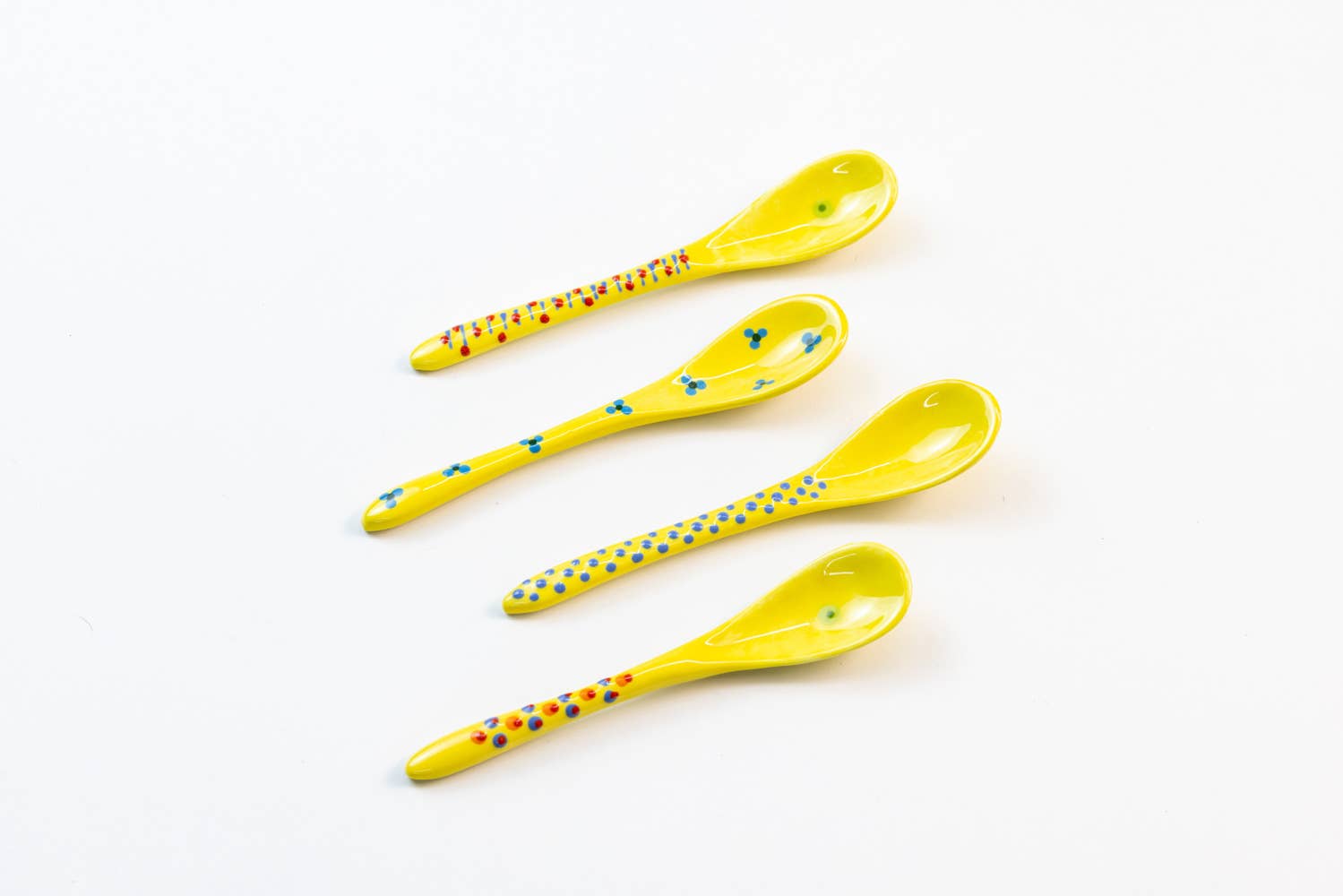 These little ceramic spoons are perfect to use with our nut bowls. 4.3" x 1.1" in size. Handmade and hand painted by the artisans at Potterswork in a small community just outside Cape Town, South Africa. Colorful & sweet, each ceramic piece is also dishwasher and microwave safe. Available in 4 base colors; Indigo, Jasper Green, Orange and Yellow. These Small Spoons are the perfect size to use with the Ceramic Mini Nut Bowl! Potterswork ceramics are individually hand crafted and hand painted -- which is what makes these ceramics so special. Please be aware that the pattern on the ceramic piece you receive may appear slightly different from the website photos, but will be consistent with the theme of the design.