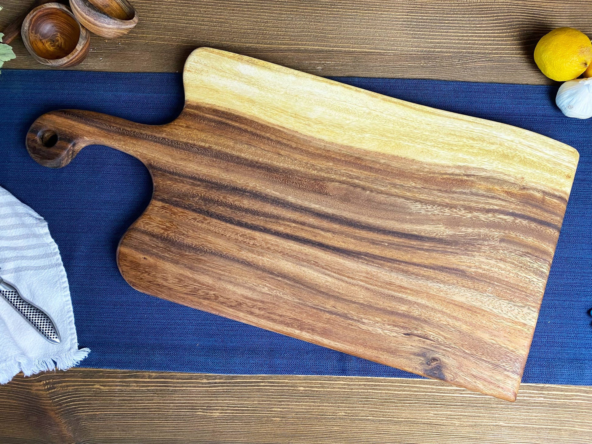 Our extra large handled boards are made from one piece of East Indian Walnut and measure 24" x 12" x 1". Hand-crafted live edge boards are perfect for serving charcuterie, appetizers, and highlighting entrees. Each board is unique, as we allow the organic nature of the tree to shape each board with a natural live edge. Our boards are beautiful, durable, and coated with a food safe blend of organic beeswax and mineral oil. Tuckahoe Hardwoods was started by brothers George and Johnny Dent in 2004 out of an old farmhouse on the Eastern Shore of Maryland. After developing our business here in Maryland, we started some sustainable forestry projects in Indonesia, where we now own and operate our own shop, using only sustainably harvested wood for all of our products. Production is started there, and everything is finished here in Maryland.