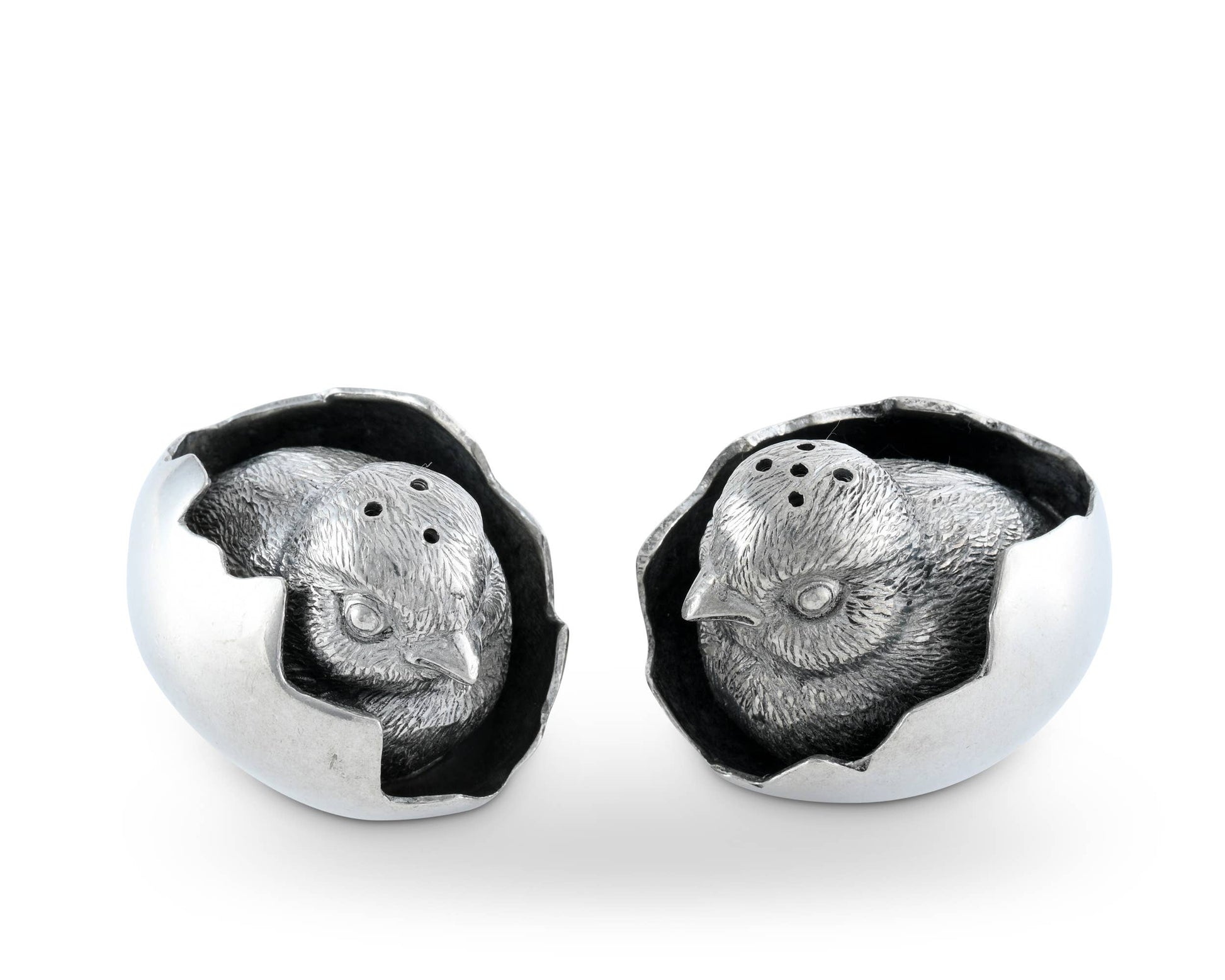 Darling newborns peek out from their just broken shells to create Vagabond House's Chicks in Eggs Salt and Pepper Set. Crafted in luxury-grade pewter, details abound on these little sweethearts, They are wrapped in fluffy chick down and greeting their new world with big curious eyes. You will have everyone at your table wanting salt and pepper again and again. And you will know the requests are made just so your guests can hold the babies. Size: 2.5" L x 2" W x 2" T Care: Hand or machine wash. Use lowest heat setting on dishwasher, non-acidic cleanser