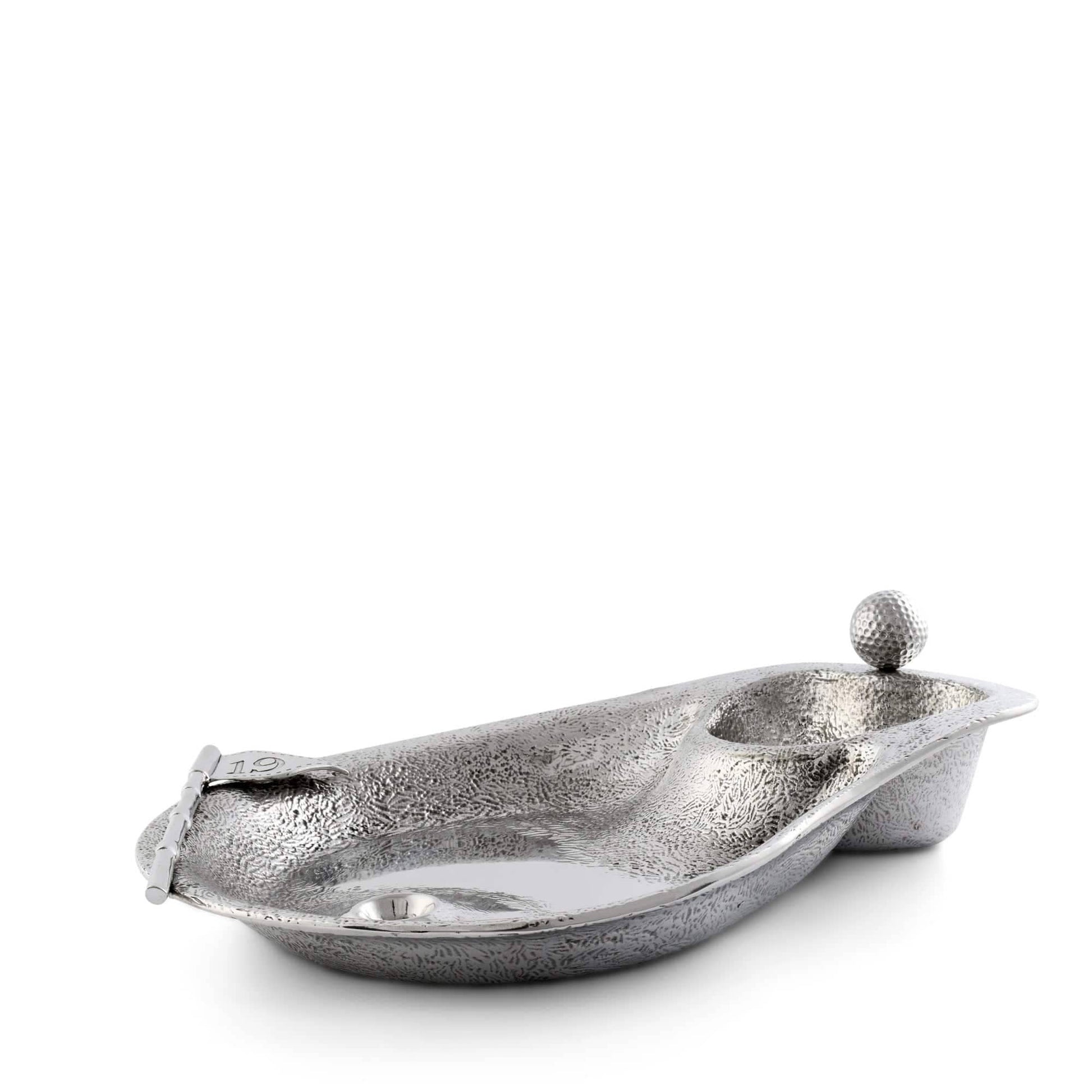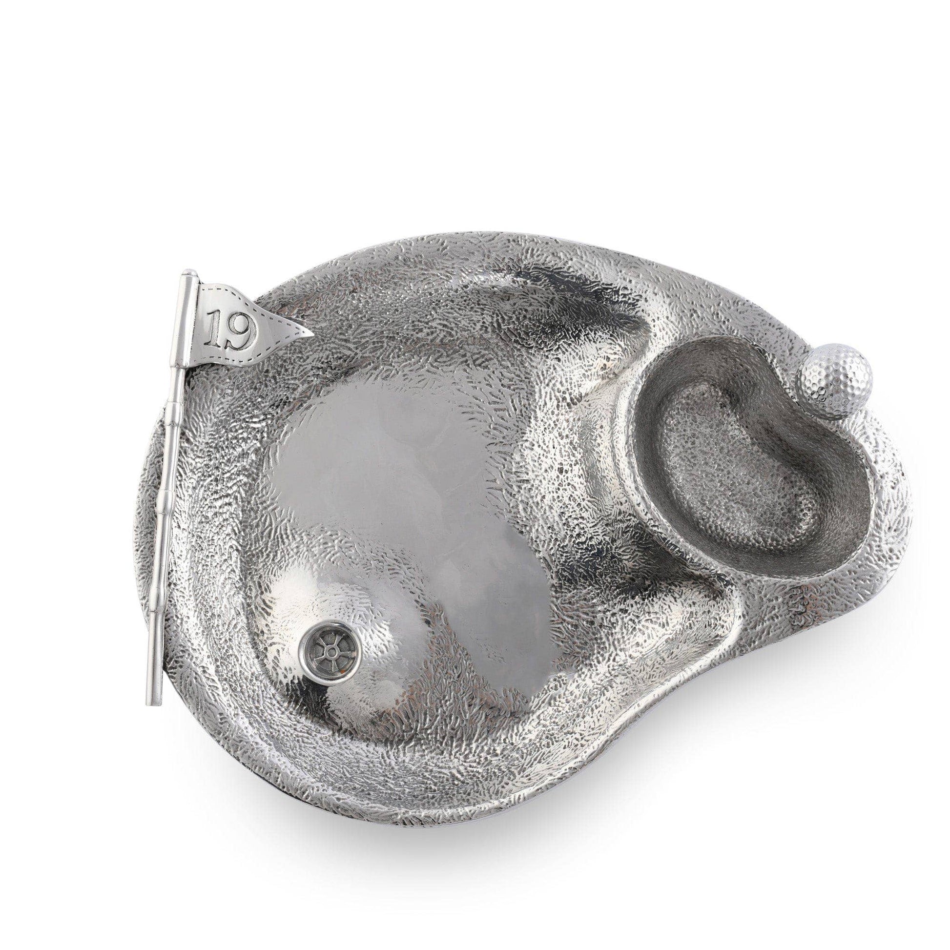 Elevate your hosting game with the Arthur Court Metal Golf Green Chip and Dip Tray, a beautifully crafted piece that blends functionality with a love for golf. Designed to mimic a golf green, this tray offers a spacious area for chips or snacks, while the cleverly integrated sand trap-shaped dip bowl adds a playful twist to your serving setup. Perfect for golf enthusiasts or anyone who enjoys unique and stylish gatherings, this metal tray is not just a serving piece but a conversation starter. Durable and perfectly sized for entertaining, it's an ideal choice for sports-themed parties, casual get-togethers, or as a charming gift for a golf lover. With this tray, you're sure to make a stylish impression at your next event.