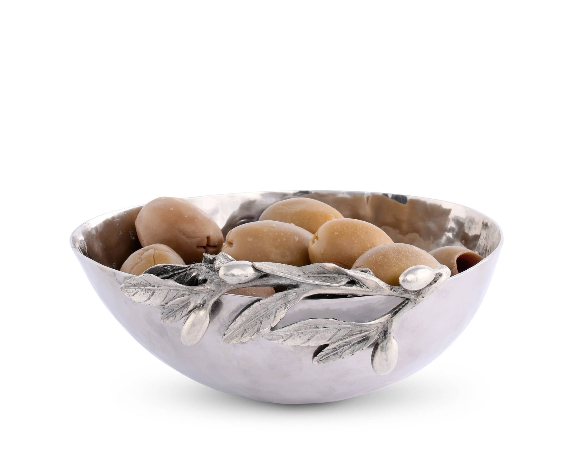 Serve your guests with natural and elegant style with Vagabond House's Olive Grove Stainless Steel Bowl. The highly polished, hammered stainless steel bowl is embellished with a figural pewter olive branch, designed with signature Vagabond House detail. The branch is adorned with twigs, leaves and olives. Size: 5.5" L x 4" W x 2.5" T Care: Hand wash recommended and dry with a soft cloth