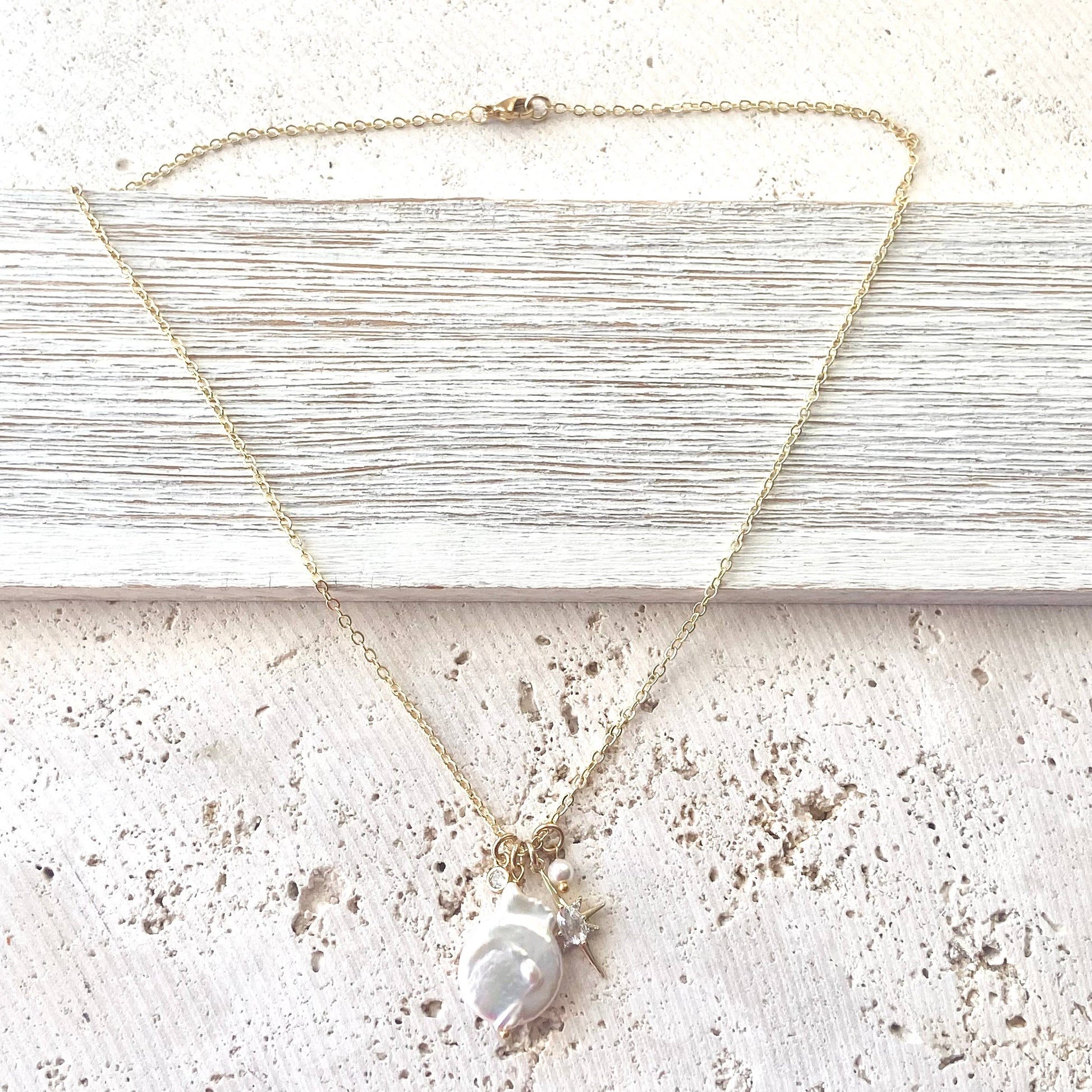 This is a beautiful cluster that features a natural genuine baroque fresh water pearl, a 4mm fresh water pearl and a beautiful star charm. This necklace is on an anti tarnish chain.