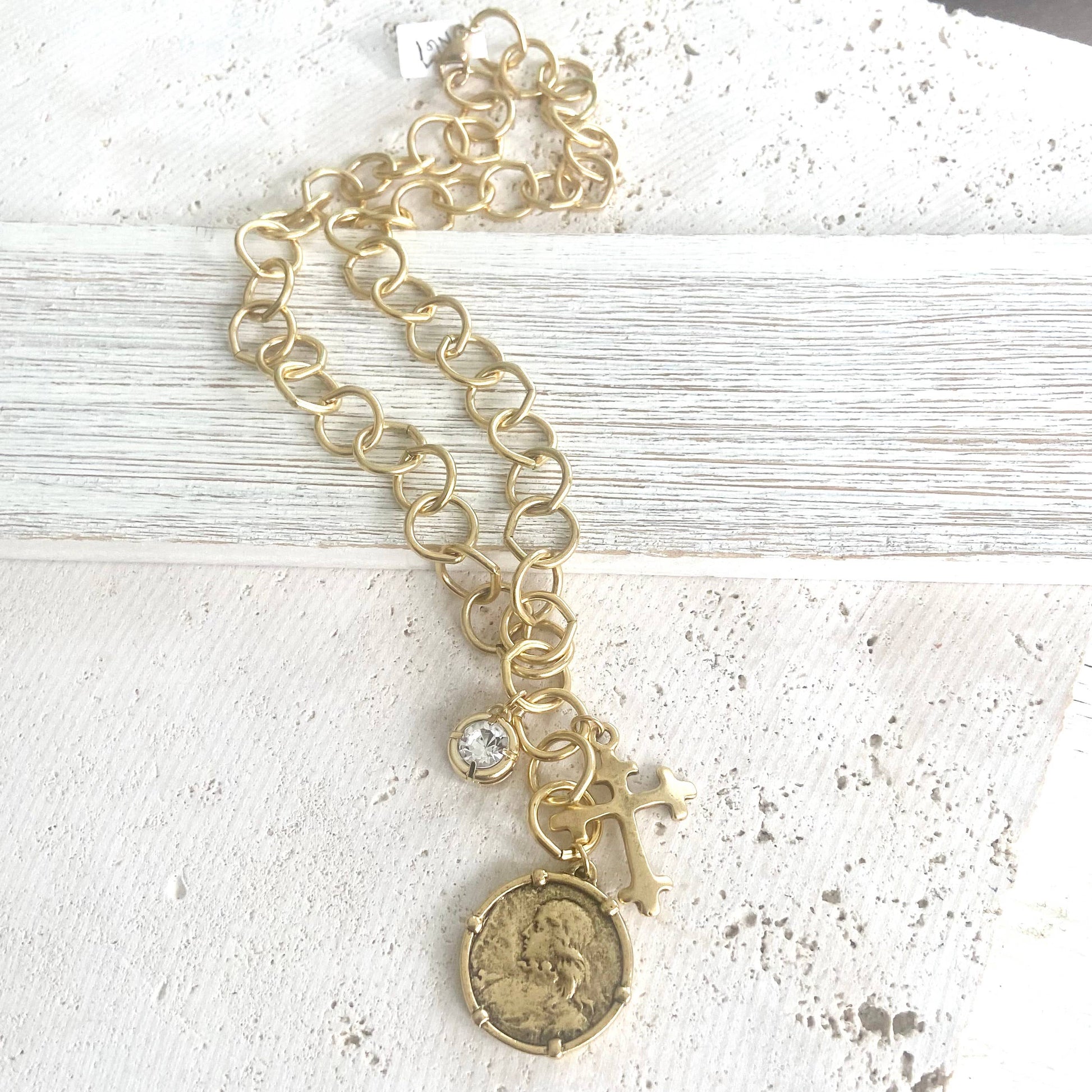 This chunky Joan of Arc coin charm necklace is timeless and vintage modern vibe. It feature a hand casted double sided coin with Joan of Arc on it. This is a perfect gift for celebrating strong and courageous women.