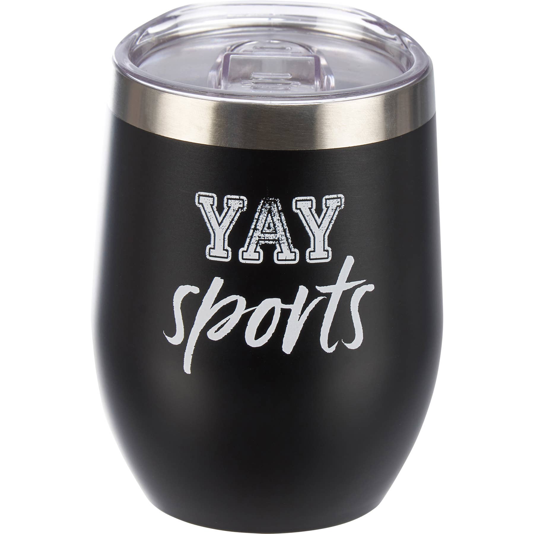A 12 oz stainless steel wine tumbler from our Sports Collection displaying a fun "Yay Sports" sentiment with distressed details. Insulated wine tumbler keeps beverages hot for 4 hours or cold for 8 hours and includes a plastic lid with rubber seal. Our Yay Sports wine tumbler comes packaged in a kraft paper box. Hand-wash only; do not microwave.
